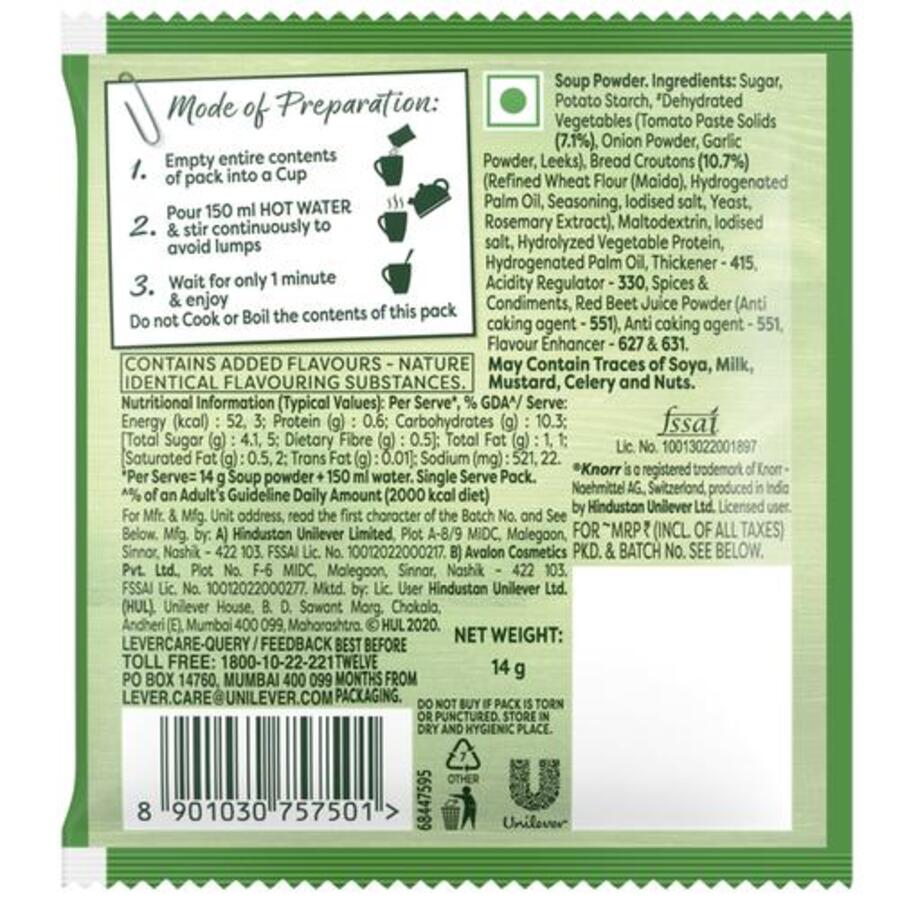 Tomato Chatpata Cup-A-Soup is the perfect combination of tomato with sour, sweet, salty, and spicy flavours making this cup-a-soup an instant hit. Knorr Tomato Chatpata Cup-A-Soup satisfies your small hunger pangs in just 1 minute. It's crunchy, delicious and easy to make every time. Made with 100% real vegetables and no added preservatives, this soup is ready in three simple steps. So now enjoy Restaurant like delicious Soup at home. Knorr Soups range comprises 11 delicious flavours of 4 serve soups and 7 flavours of Cup-a-soup. Great taste is in our Nature! Knorr has gone to great lengths to ensure a perfect blend of Ingredients and consistency that give you Restaurant Soup at home.