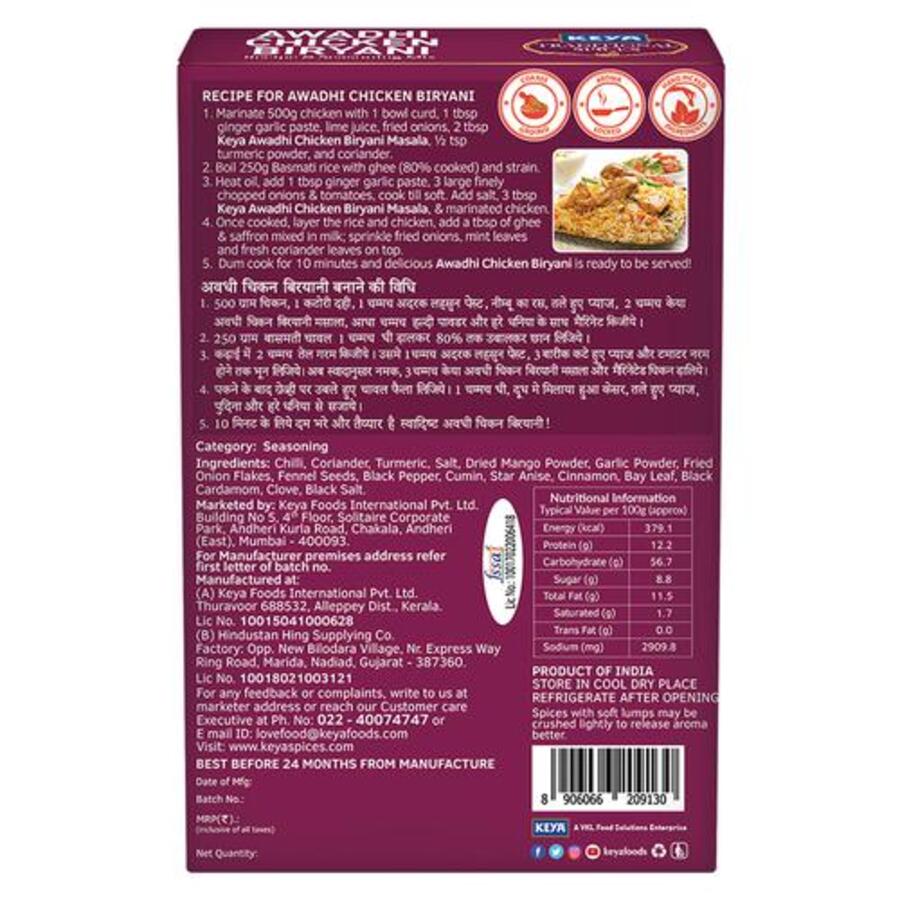 Keya Khada Masala blends are whole spice mixes, hand-picked in the right proportion by expert chefs, gently blended and coarse ground to unlock its taste and aroma only while cooking. The magic of aroma-locked Awadhi Chicken Biryani Masala comes alive with flavourful bursts of real whole spices.IngredientsMixed Spices (Coriander, Fennel, Black Pepper, Cardamom, Chilli, Star Anise, Cinnamon, Turmeric, Clove, Ginger, Cumin), Iodized Salt, Dehydrated Onion, Dehydrated Garlic, Sugar, Milk Solids. Contains Added Flavour - Nature Identical Flavouring Substances (Biryani).